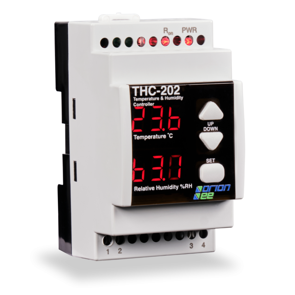 THC-202 is designed to control temperature and humidity by means of a heating resistance in order to prevent high humidity or low temperature levels. The device is equipped with two digital inputs to set threshold values and a relay output. Its relay is programmed to be activated where ambient temperature is less than the set temperature or ambient relative humidity is higher than its set value.