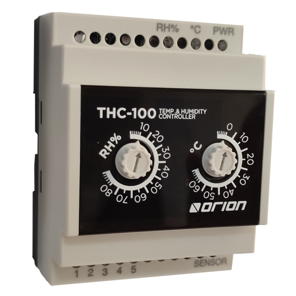 The THC-100 is designed to control temperature and relative humidity by means of heating resistance in order to prevent high humidity or low temperature levels. The device is equipped with one sensor input, one relay output and two analog inputs for setting threshold values. The relay is programmed to change positions when the ambient temperature is lower than the set temperature or the ambient relative humidity is higher than the set value. Accordingly, temperature increases, and the relative humidity decreases depending on the increasing temperature.