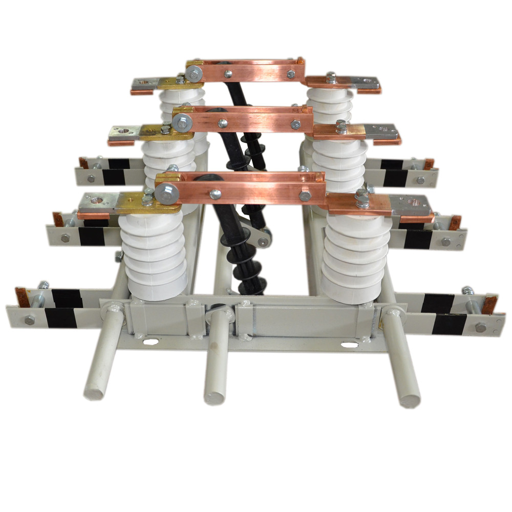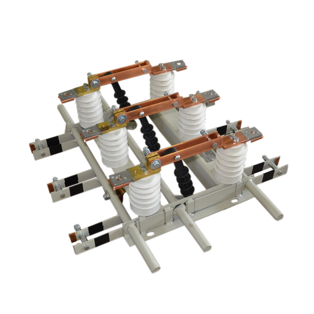 RVZ-10/1000 II U3 Disconnector for internal installation for rated voltage 10kV and rated current 1000A, with an interphase distance of 200mm, grounding knives are located on the side of hinged contacts, climatic version "U", placement category "3" according to GOST 15150-69.